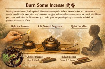Burning incense is completely optional. Many tea masters prefer to burn incense before tea ceremonies to set the mood for the room, clear it of unwanted energies, and set aside some extra time for a small mindfulness practice or meditation. At this moment, you can let go of any pestering thoughts or worries and dedicate yourself to the world of tea. It's important to note here that the incense we find in China are light and mellow, usually made solely from different types of wood without the addition of any strong aromas or spices. They are quite different from the Indian incense many of us are used to and set an overall different tone for the room. If you can, try getting your hands on some of the incense from mainland China.